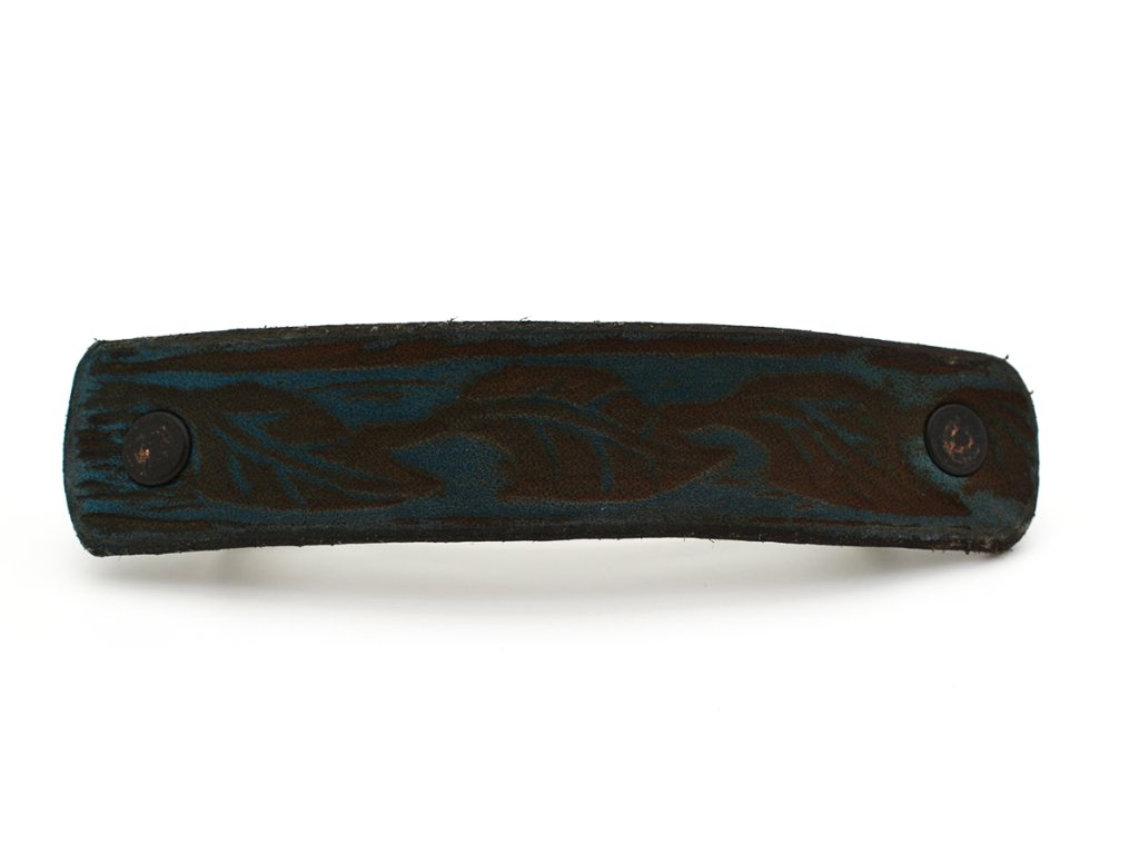 Zadná strana spony má modrohnedú farbu. Zapínanie 8 cm dlhé, široké 1 cm je pevne prichytené o kožu nitmi medenej farby. Jemný reliéf listov pochádza z kožiarskej remeselnej dielne ARI.