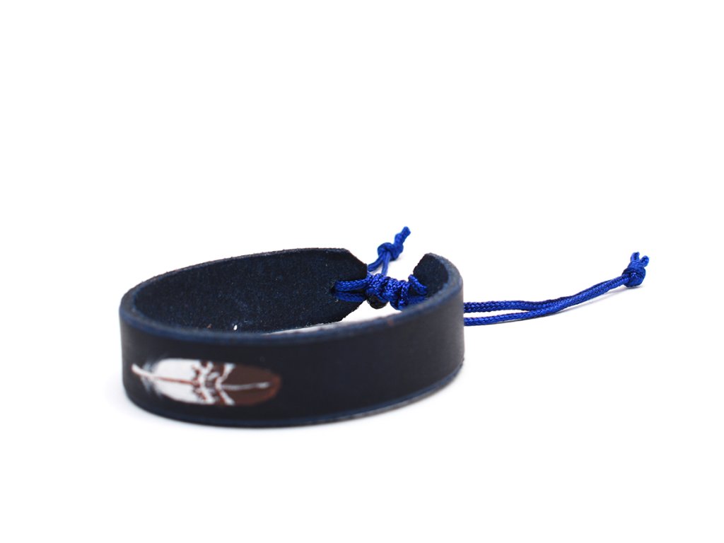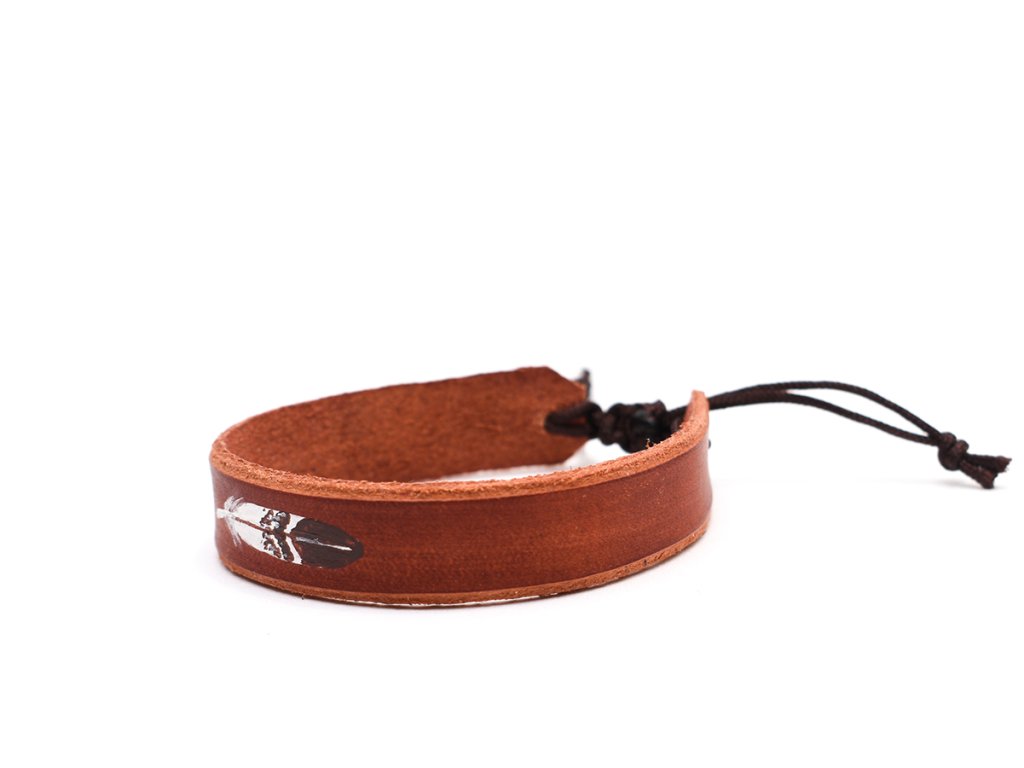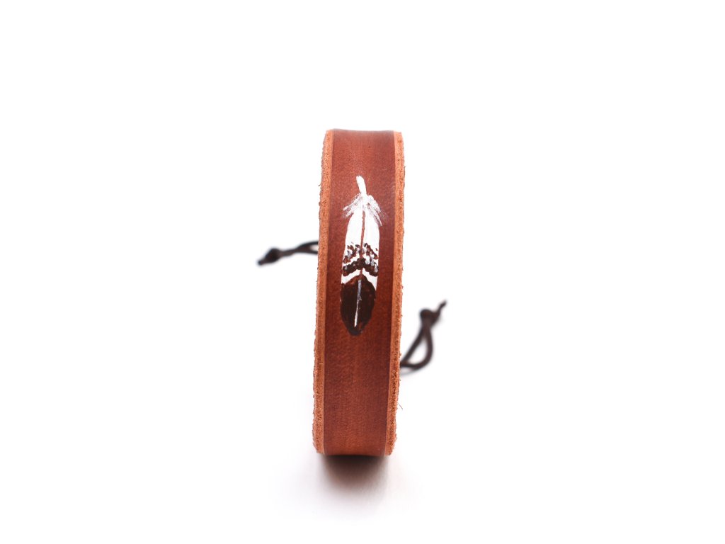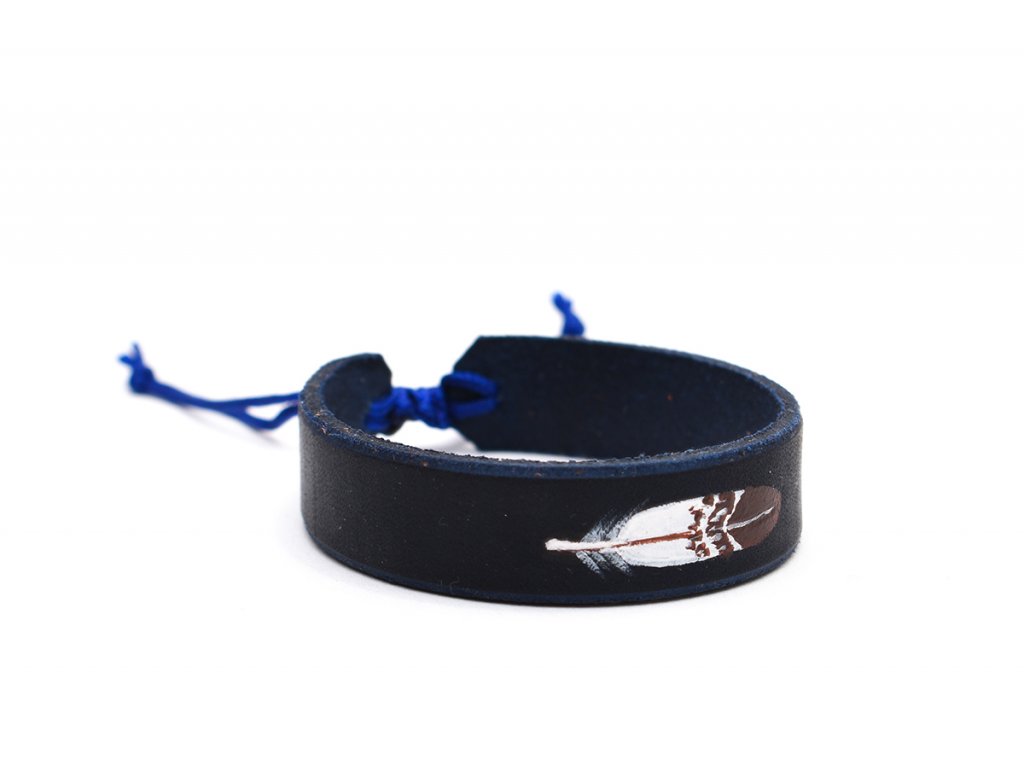 Náramok zdobený ručnou maľbou s motívom orlieho pierka. Vyrobený z hovädzej kože, šírka cca 1,2 cm.